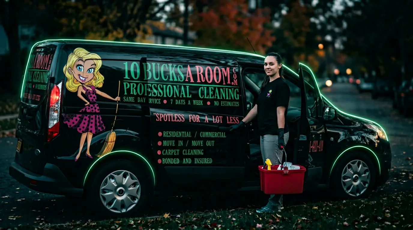 Bold colors, big phone number, simple message. The CleanBucks design system is built to read at a glance from 30 feet away.